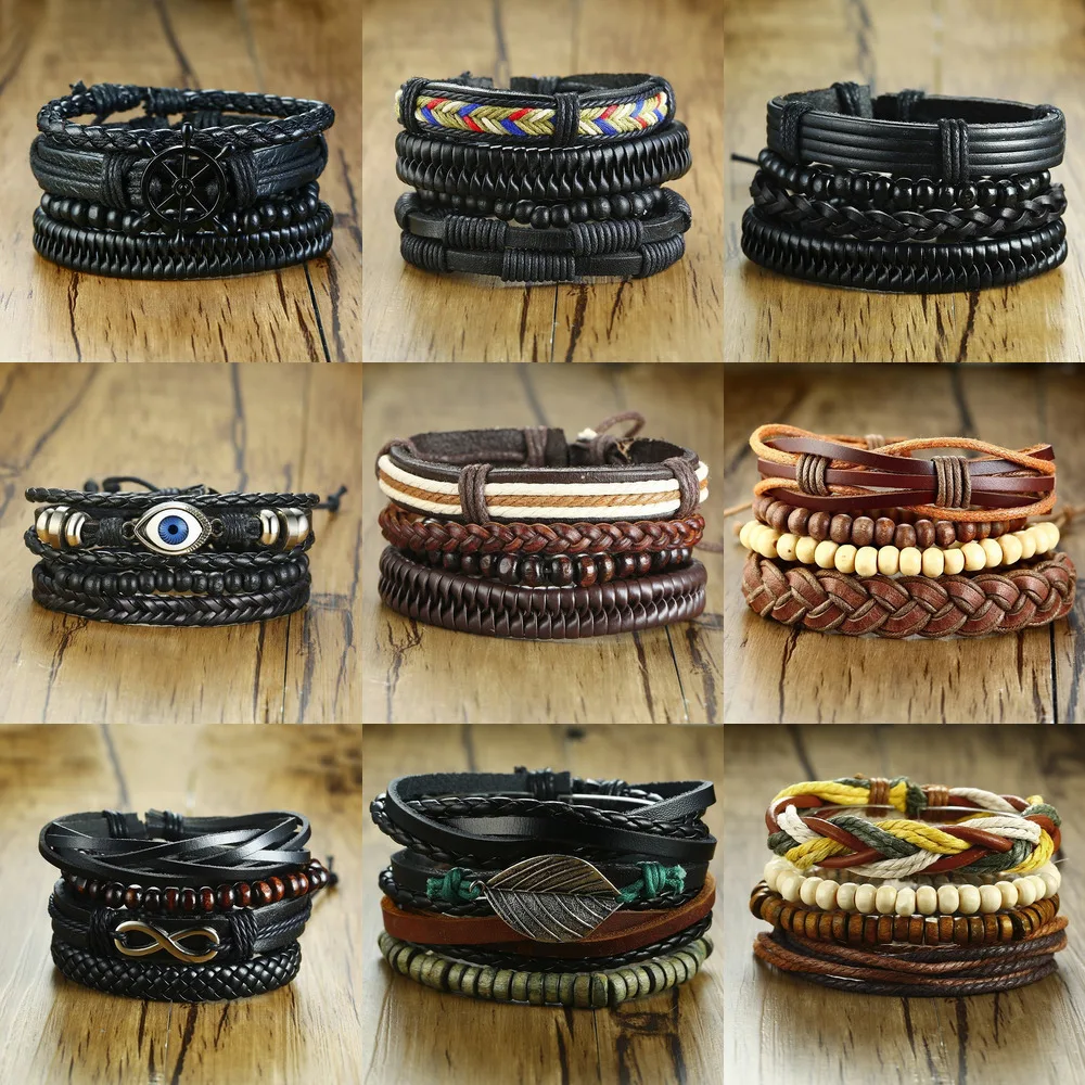 4Pcs/ Set Leather Bracelets Braided Wrap for Men Women